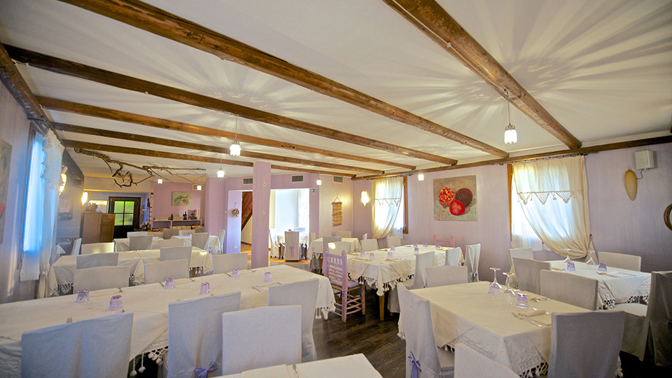 The dining room is welcoming and is decorated in pastel colors, with a large Valesian fireplace that gives the room intimacy and warmth; ideal for romantic dinners, for ceremonies or business meetings.