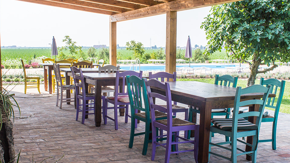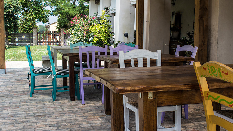 Our porch, typical of country houses, has an open part, with wooden tables and colored chairs, ideal for summer breakfasts and dinners, as well as for aperitifs with friends.